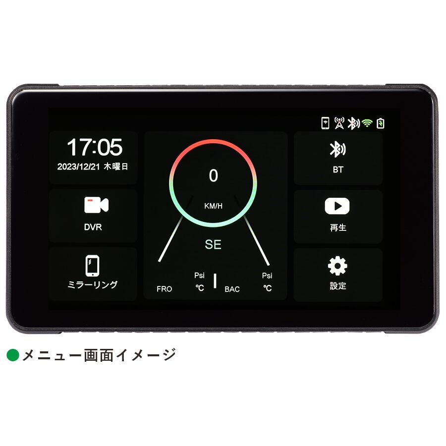 バイクのビジュアルを損ねることのない高級感あふれる質感とシンプルなデザイン。エンジンをかけると同時に自動で立ち上がり、基本メニューとタイヤ圧などが表示され、ドライブレコーダーの録画がスタート。
